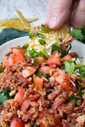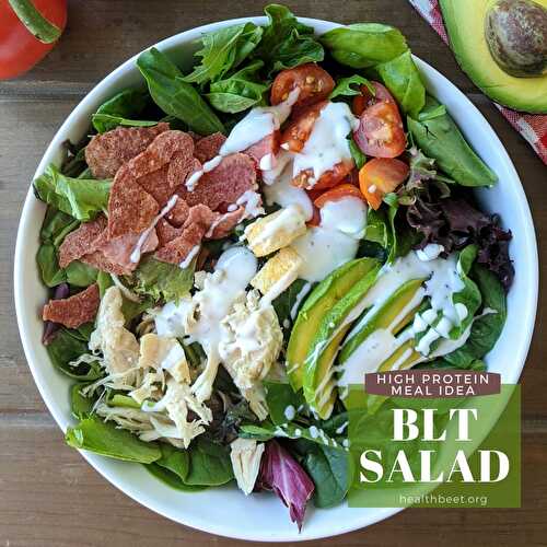 This BLT Chicken salad is ready in 5 minutes! You'll love this high protein lunch idea with added turkey bacon, avocado, lettuce, and chicken.