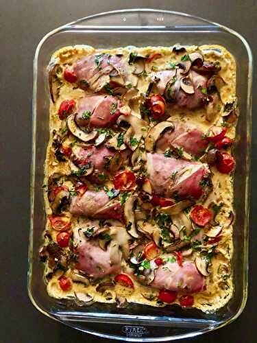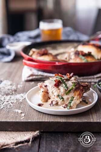 Creamy herby chicken thighs in a delicious bacon mushroom gruyère sauce.