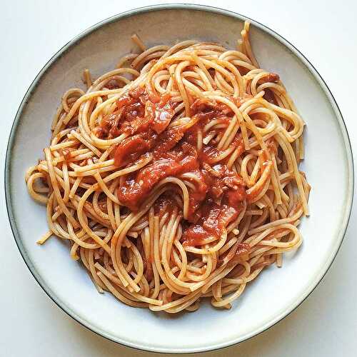 This bacon pasta with tomato sauce is a quick and easy spaghetti recipe you can make with fresh or canned tomatoes.