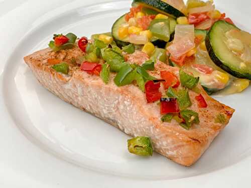 An easy way to make healthy & delicious Confetti Salmon Steaks.