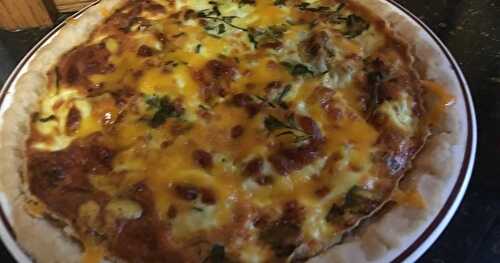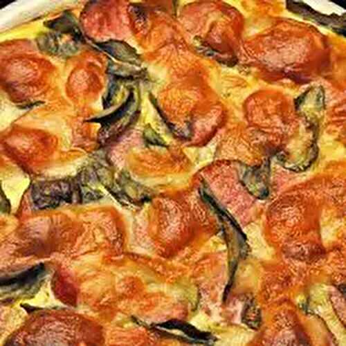 Sausage and Tomato Quiche, with onion, red pepper and smoked cheese, in a shredded potato crust