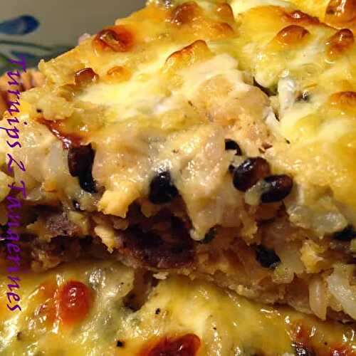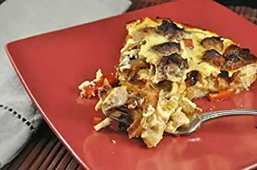 An easy, colorful quiche with red peppers, leeks, sausage, and a shredded potato crust.