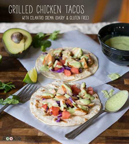 These simple Grilled Chicken Tacos with Cilantro Crema make a quick, healthy, and allergy-friendly weeknight meal with leftover grilled chicken!Gluten free, Dairy free; Also free of: soy, eggs, nuts
