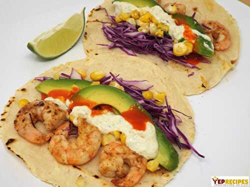 Marinated shrimp grilled, then topped with shaved cabbage, avocado, grilled corn and a light jalapeno cream on a tortilla.