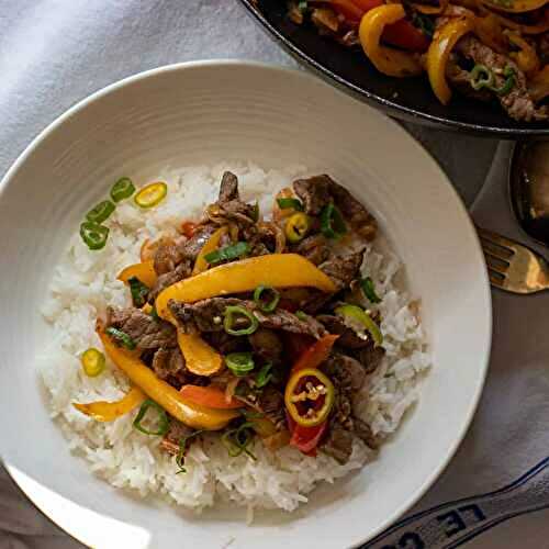 Easy Pepper Steak a stir-fried Chinese American dish of sliced beef steak cooked with sliced green and red bell peppers mixed with soy sauce and ginger, and thickened with cornstarch.