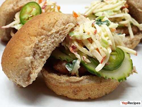 Mini turkey burgers are topped with apple-coleslaw and quick sweet and sour pickles.