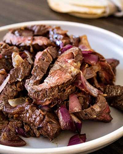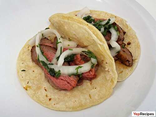 Broiled flank steak marinated in cumin, chilis, and lime juice in corn tortillas with marinated onions.