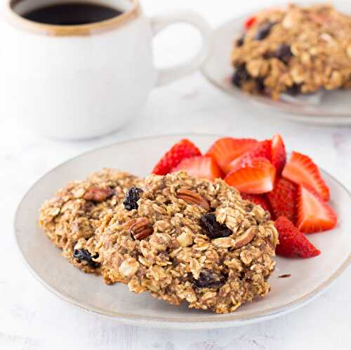 These pumpkin breakfast cookies are jammed with nutritious ingredients but taste like treats! Made with whole oats, pumpkin, nut butter and flax seeds, these vegan and gluten-free cookies, which are flavored with maple syrup, warming spices, cranberries.