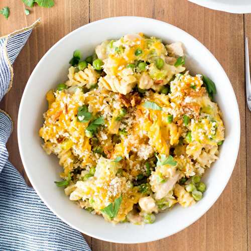This healthy tuna noodle casserole is cheesy, creamy, and packed with juicy chunks of tuna! No canned soup, but easy peasy to whip up!