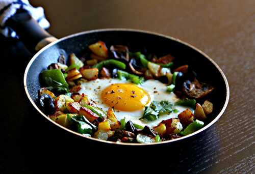 An easy healthy potato hash with veggies and fried egg on top.
