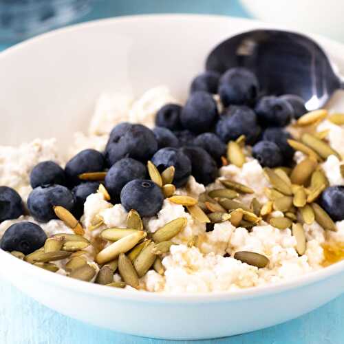 These blueberry cottage cheese overnight oats are a super filling high protein breakfast topped with sweet honey, blueberries, and crunchy pumpkin seeds.