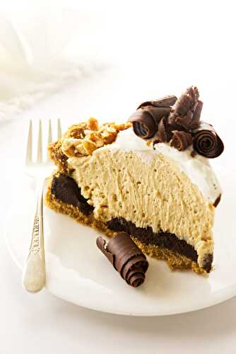 This easy, no-bake peanut butter pie is filled with a fluffy peanut butter mousse over a layer of rich fudgy chocolate.
