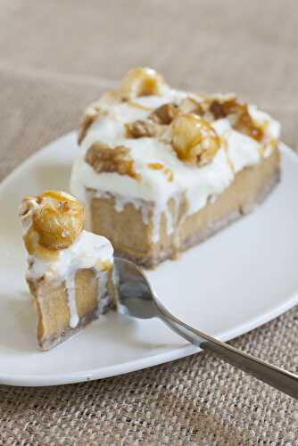 Creamy and fluffy vegan pumpkin cheesecake with gingerbread crust.