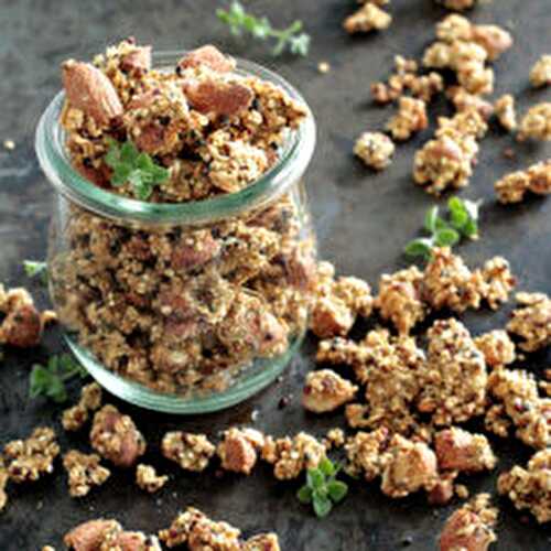 Delicious savoury quinoa granola with almonds, sesame seeds, sunflower seeds and a spicy mustard-tahini dressing.