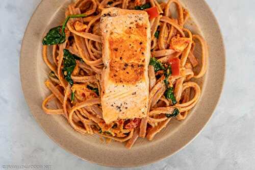 Creamy Tuscan Salmon Pasta Recipe: How to make salmon pasta with homemade creamy sun-dried tomato pesto and spinach in 20 minutes.