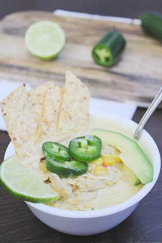 This Slow Cooker Creamy Chicken Chili is so easy to make, plus, this recipe is tummy friendly with no beans, dairy, or glutenGluten free, paleo; Free of: dairy, eggs, soy, nuts (except coconut), corn, beans