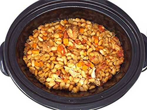 A slow cooker version of the French stew, made up of boneless chicken thighs, homemade pork meatballs, and great northern beans.
