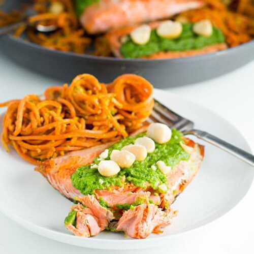 Pan Fried Salmon with Macadamia Arugula Pesto served on top of a bed of pesto carrot noodles is a delicious one pan dinner served in less than 30 minutes!