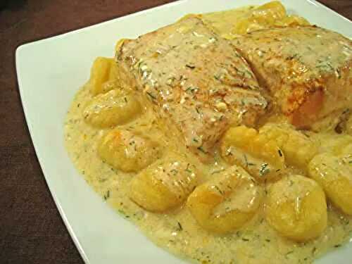 Pan-Fried Salmon with fried, crispy Gnocchi and a light dill yogurt sauce, perfect for a lazy weekend dinner