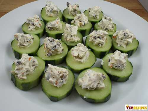 A quick and delicious vegetarian appetizer, cucumbers filled with cream cheese, olives and dill.
