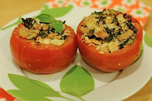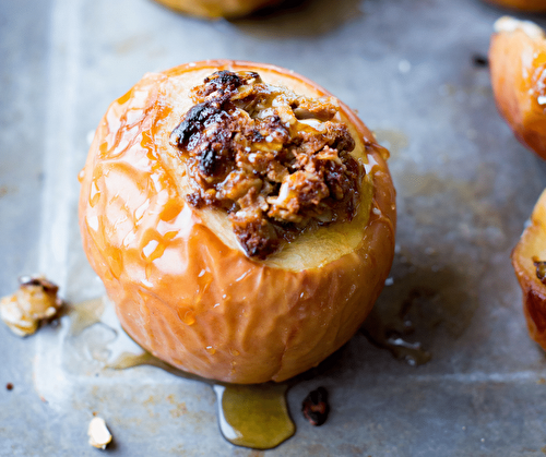 Apples, hollowed out and stuffed with an herb, chicken and cranberry stuffing, baked until golden brown.