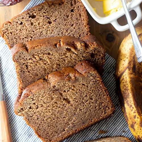 This banana date bread is packed with three cups of dates and bananas blended and baked into the base of the bread for a delicious breakfast or snack!