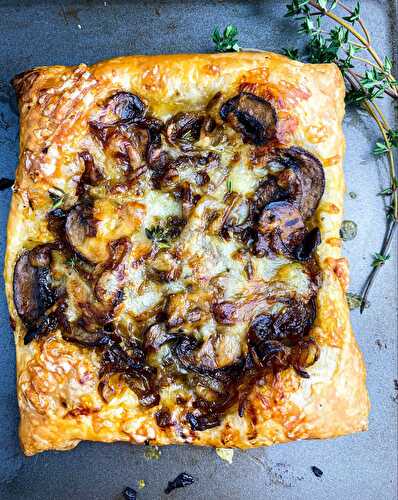 This incredible mushroom tart starts with puff pastry, gruyere cheese, and caramelized shallots glazed in balsamic.