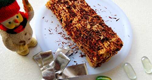 Delicious recipe for a homemade Buche de Noël (yule log), easy and quick to make with a chocolate sponge cake, a hazelnut praline whipped ganache and a chocolate praline crisp (for 8-10 serving)