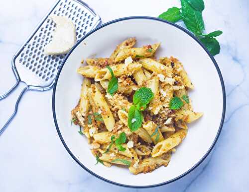 Hearty and delicious sun-dried tomato pesto pasta with roasted almond and fresh mint leaves.