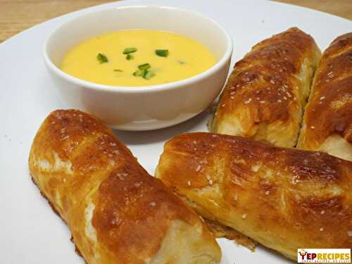 Homemade pretzel breadsticks with an easy to make sharp cheddar and serrano pepper dip.