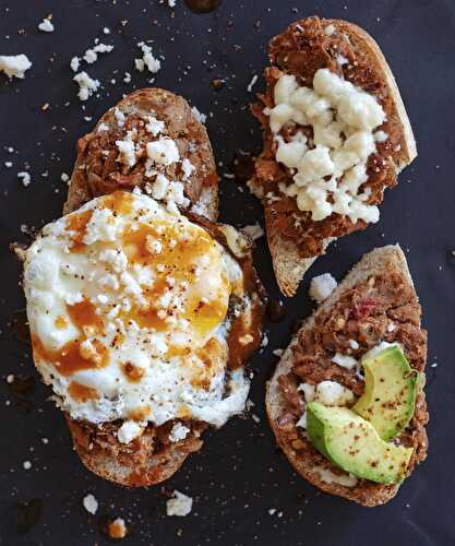 Molletes beat avocado toast any day! These open-faced breakfast sandwiches are made by slathering refried beans onto toasted bolillo rolls and then heaping avocado slices, a fried egg, hot sauce, and lots of cheese on top.