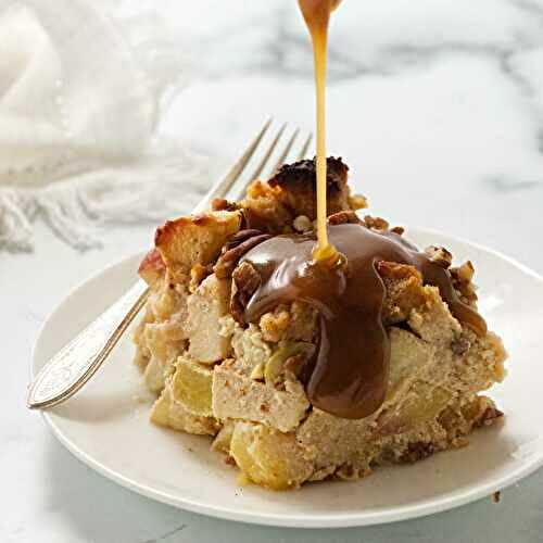 Apple Pecan Bread Pudding is a cozy combination of spiced apples, pecans, and maple custard, topped with a creamy maple sauce.