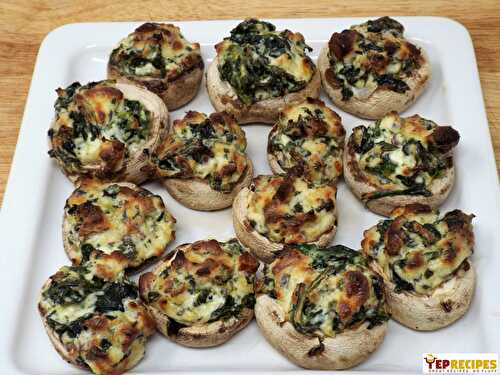 Mushroom caps stuffed with cream cheese, Gruyere, pecans, garlic, and spinach.