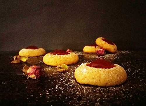 Pistachio Thumbprint Cookies with Rose Jam : inspired by Rose Petals Turkish Delight.