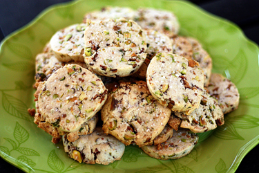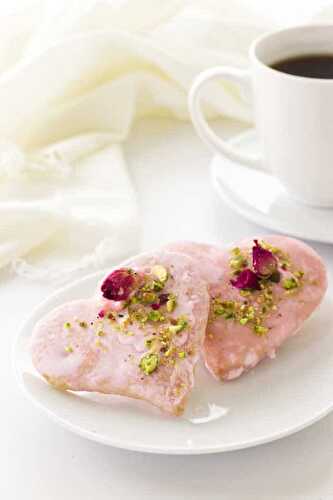 These pretty heart-shaped Rose Pistachio Cookies have a delightful rose water flavoring, chopped pistachios and the crunch of biscotti.