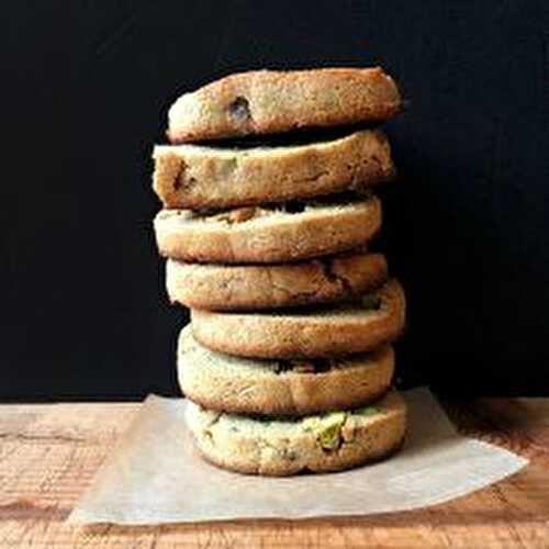 A delicious pistachio and chocolate chunk cookie recipe! Crispy, airy and tender, these cookies keep for up to ten days when stored in an airtight container!