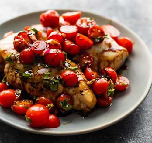 Bruschetta chicken is made with all the flavors of a caprese bruschetta - cherry tomatoes, basil, fresh mozzarella and drizzle of balsamic glaze – all topped on grilled or baked chicken cutlets!
