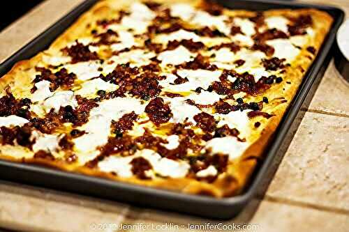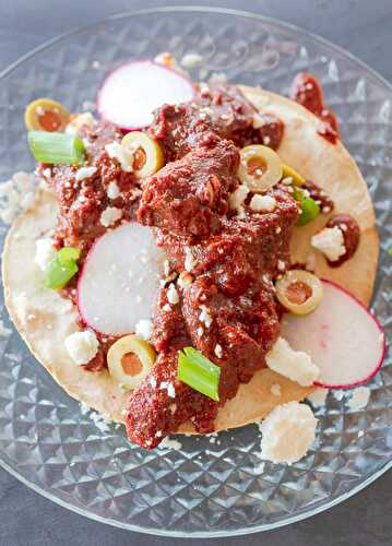 I replaced the beef with crispy tofu, which adds just the right amount of heft and bite, and served it on crunchy baked tostada shells topped with Queso Fresco, scallions, radish and sliced pimento-stuffed olives.