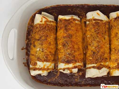 Chuck roast slow cooked in a homemade enchilada sauce then wrapped in flour tortillas with refried beans then topped with cheddar cheese and baked until gooey and delicious.