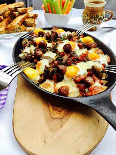A protein-packed breakfast consisting of quail eggs, bacon mushrooms and sausages baked in the oven in no time.