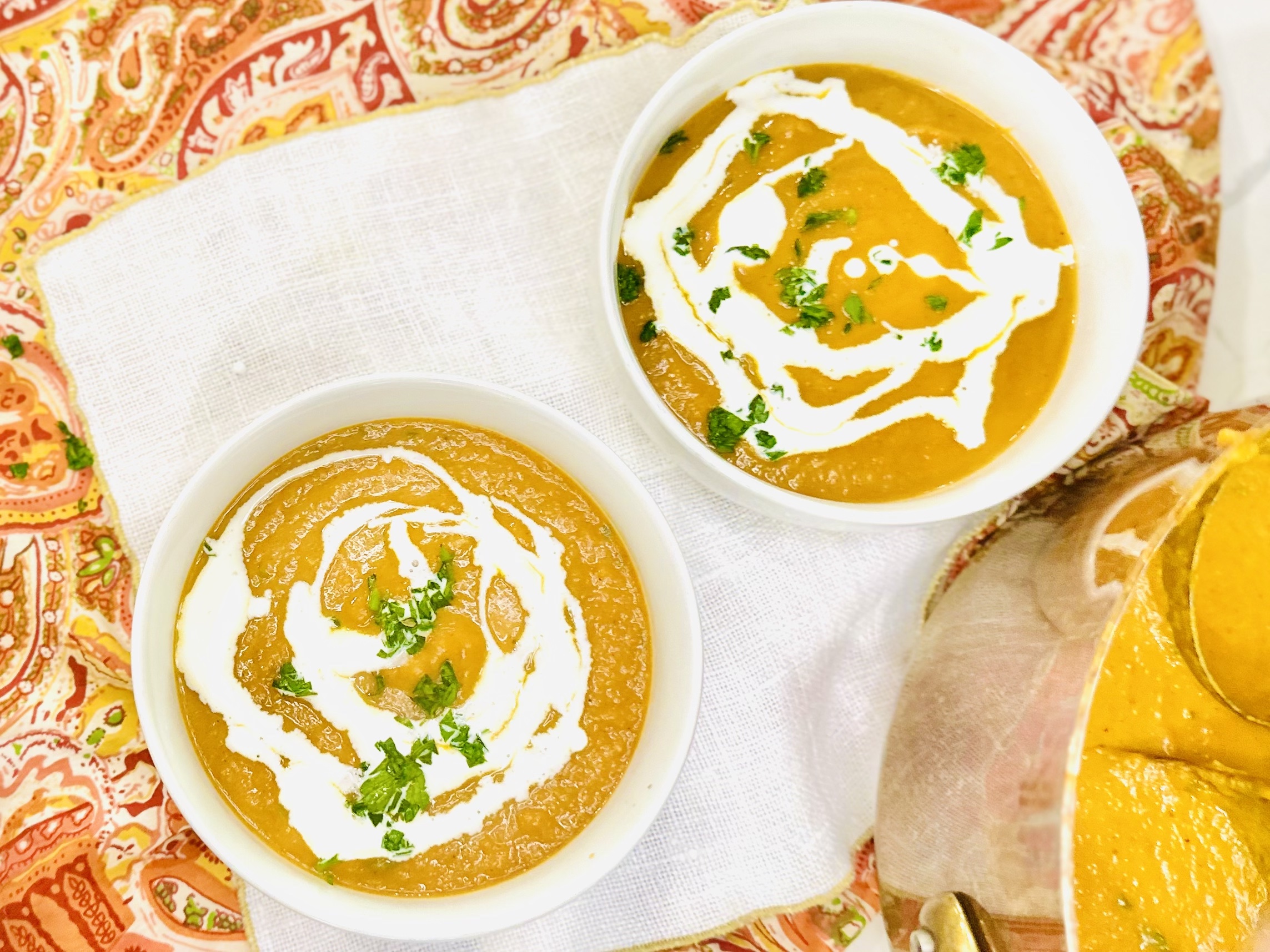 Deliciously creamy pumpkin soup, spiced with red curry paste, is so satisfying and nourishing.