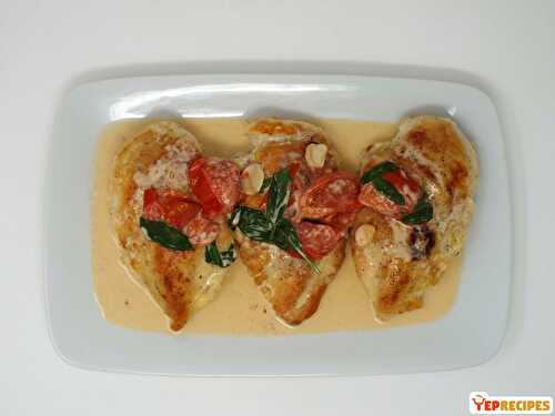Pan seared chicken breasts simmered in a cream sauce with fresh tomatoes and basil.