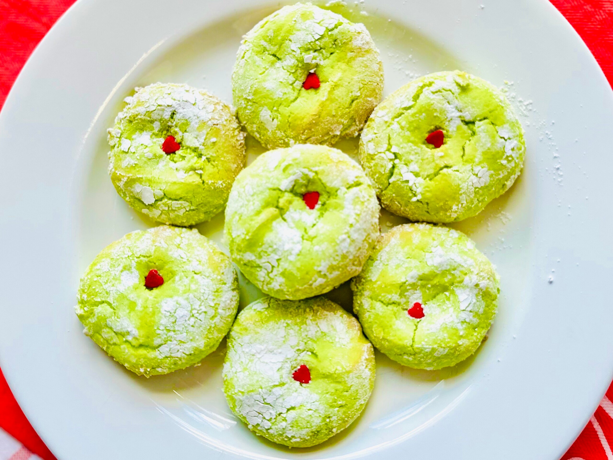 Bake adorable Grinch Christmas Cookies with cake mix! Soft, chewy, and coated in powdered sugar, they’re the perfect holiday cookie for festive fun.
