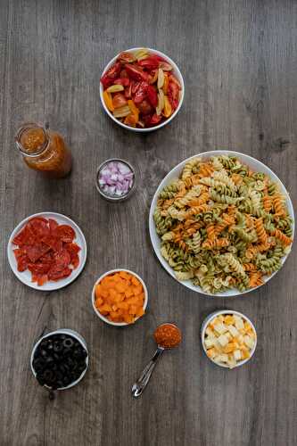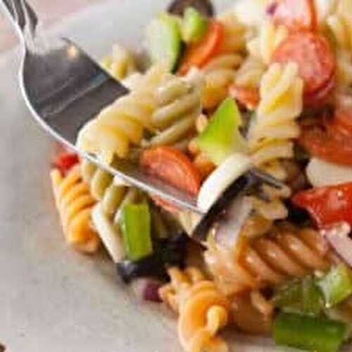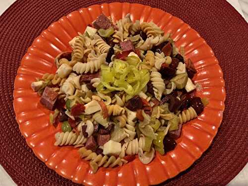 Rotini pasta, artichoke hearts, three kinds of olives, marinated roasted red peppers, pepperoncini or banana peppers, pecorino romano and parano cheese, salami or summer sausage and turkey pepperoni all tossed in Italian vinaigrette makes a delicious.