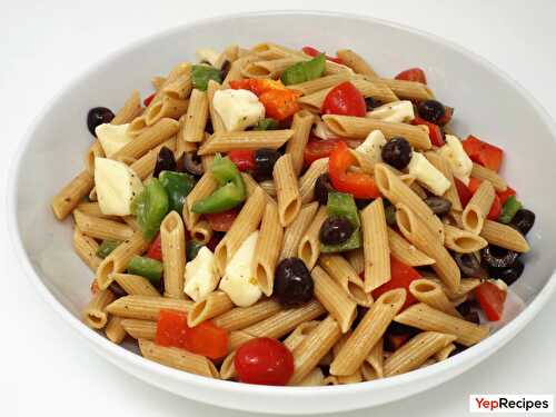 Penne pasta tossed with fresh mozzarella, onions, peppers, olives, tomatoes and an garlic vinaigrette dressing then served cold.