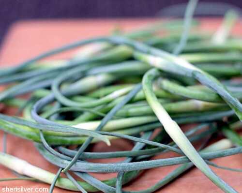 Garlic scapes - I didn't even know what these were till a few weeks ago, when our farmers market manager suggested I use them to make a pesto sauce.