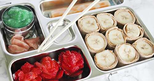 Today I have a great kid's school lunchbox for you: Banana sushi, applesauce wasabi, and Strawberry flowers.