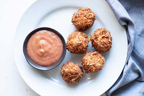 Crispy fried coconut rice balls with ribbons of toasted coconut inside and a sweet and spicy peach dipping sauce! A perfect crunchy appetizer for summer!