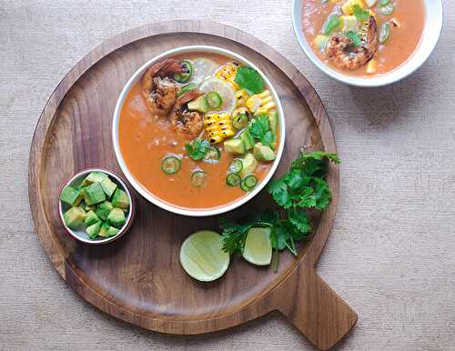 This roasted tomato soup is perfect on its own but charred corn and shrimp add special touch.