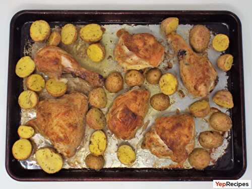 Chicken thighs brushed with a Dijon mustard sauce then baked in the oven with rosemary potatoes.